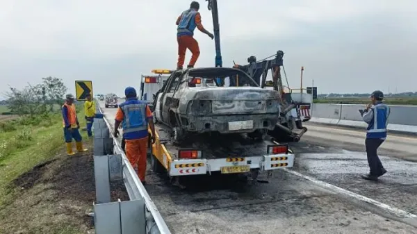 Mobil berisi 2 orang itu, terbakar saat melintas di KM 397-700, Desa Sumbersari Kecamatan Ngampel Kabupaten Kendal.
