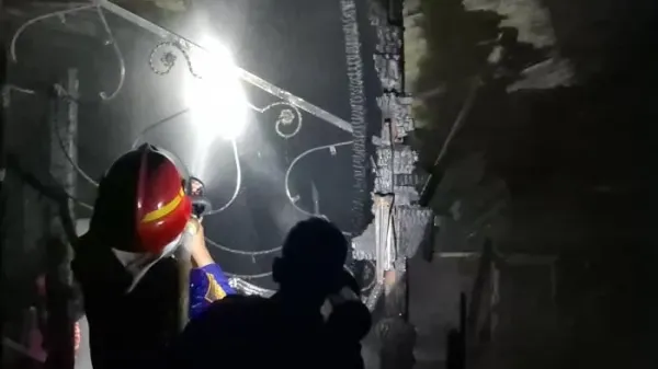 Di rumah tersebut hanya tersisa tembok yang masih berdiri dan sejumlah kayu rangka atap yang terserak di bawah.