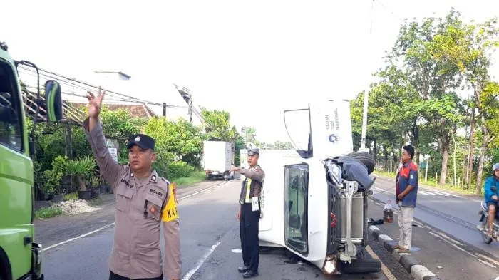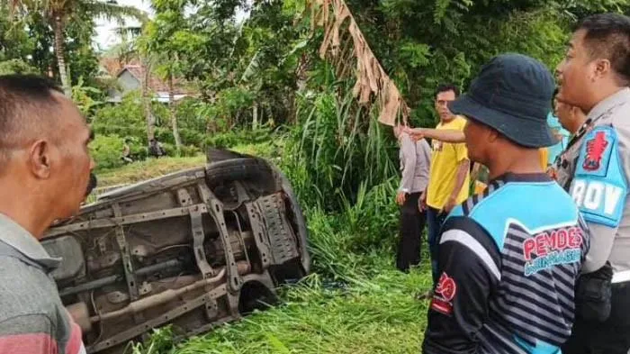 Mobil tersebut diduga mengalami pecah ban hingga menabrak pembatas jalan dan terguling.