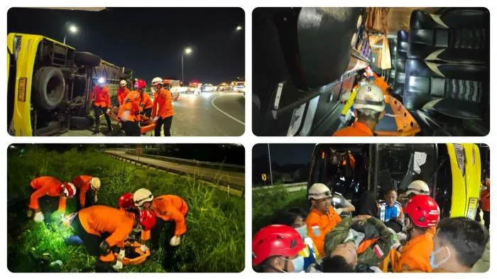 Proses evakuasi kendaraan oleh petugas berlangsung cukup lama lantaran kondisi hujan yang masih mengguyur lokasi kejadian.