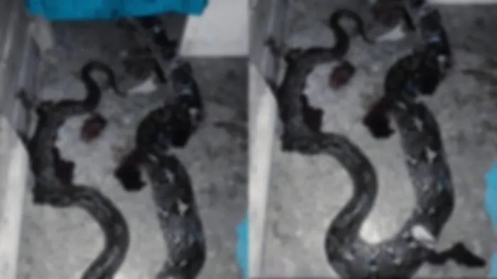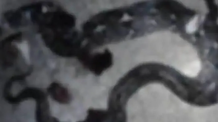 Tubuh ular tampak hancur akibat beberapa luka tebasan senjata tajam yang sangat dalam, mengakibatkan noda darah berceceran di lantai semen di sekitar bangkai ular.