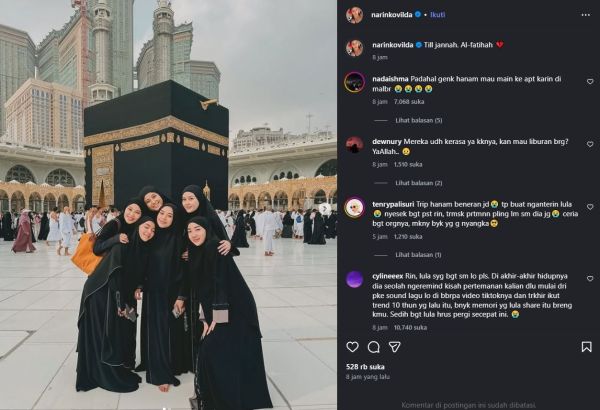 Karin Novilda atau akrab disapa Awkarin, membagikan fotonya saat bersama Almarhumah di Mekkah. Dalam caption foto tersebut, ia pun mendoakan Lula Lahfah.