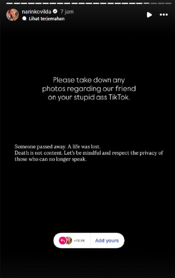 "Tolong hapus semua foto tentang teman kami di TikTok bodohmu itu," tulisnya di Instagram Story @narinkovilda.