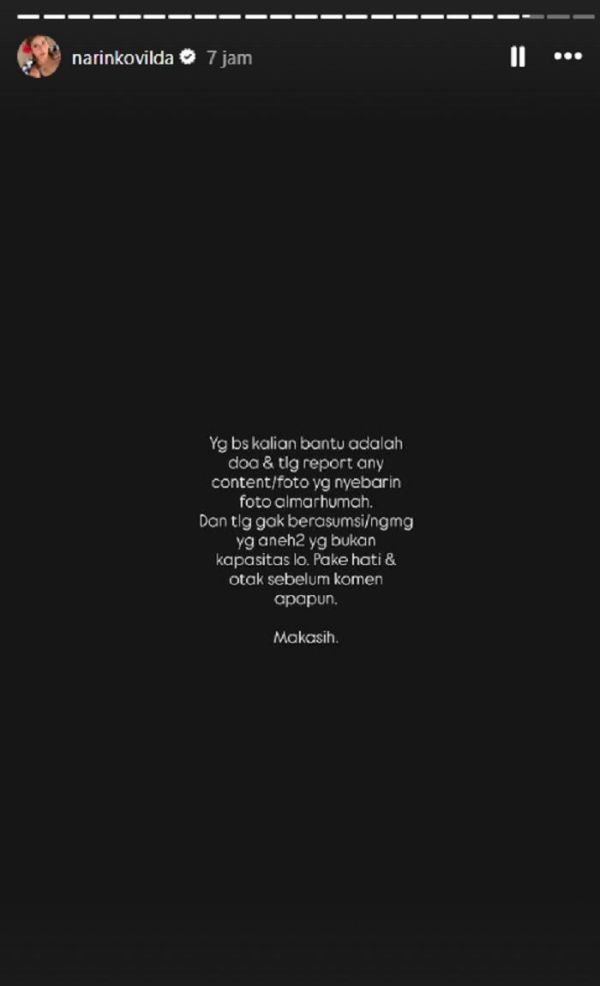 "Yang bisa kalian bantu adalah doa dan tolong report any content/foto yg nyebarin foto almarhumah. Dan tolong gak berasumsi/ngomong yang aneh2 yg bukan kapasitas lo. Pake hati dan otak sebelum komen apapun. Makasih," tulisnya.