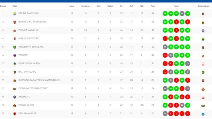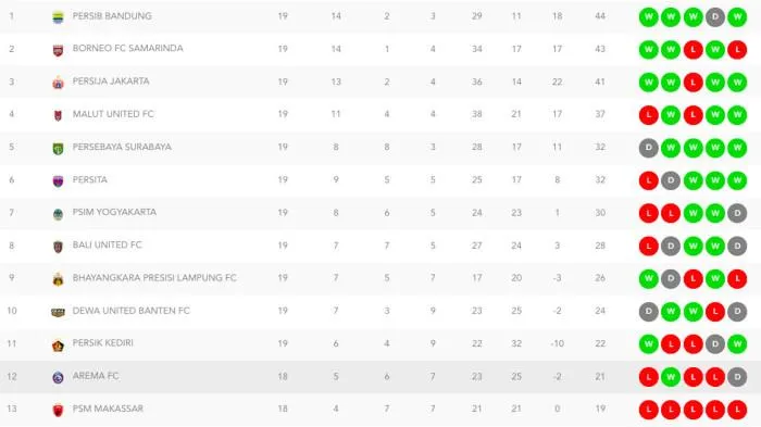 Semen Padang di posisi ke-16, dengan raihan 12 poin dari jumlah laga yang sama.