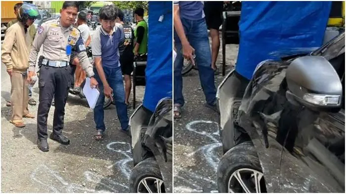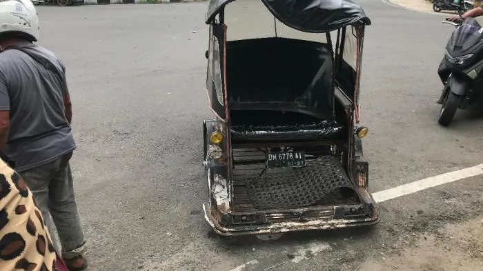 Benturan keras tak terelakkan. Mobil seharga puluhan kali lipat dari bentor itu mengalami lecet cukup jelas, sementara kap depan bentor tampak bengkok akibat benturan.