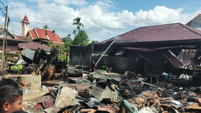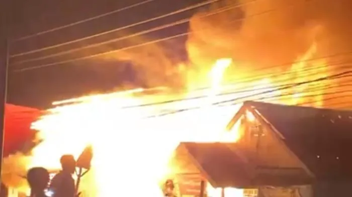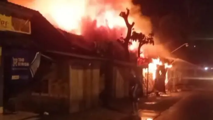 Api melahap satu persatu kios semi permanen yang ada di tepi jalan itu. Warga sempat mendengar dentuman dari dalam kobaran api yang melahap 12 kios berbahan kayu.