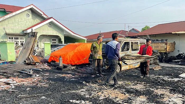 TRIBUNPEKANBARU.COM,PEKANBARU - Sejumlah orang membersihkan bekas puing sisa kebakaran di Jalan Merak, Kelurahan Tangkerang Tengah, Kecamatan Marpoyan Damai, Kota Pekanbaru, Rabu (11/3/2026). Mereka mengangkat satu persatu atap seng yang berantakan.
