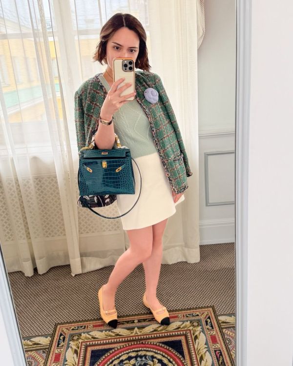 Lalu tampilannya dipermodis dengan outer berbahan tweed berwarna hijau yang menjadi statement pada penampilannya.
