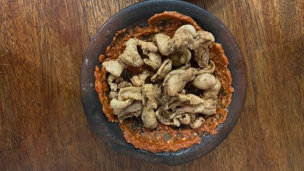 Kulit ayam yang digoreng gering dicampur dengan sambal khas serta nasi putih akan membuat makan siangmu semakin nikmat.