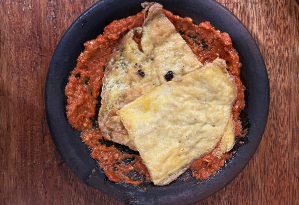 Satu porsi berisi 1 telur dadar yang dipenuet bersama sambal.